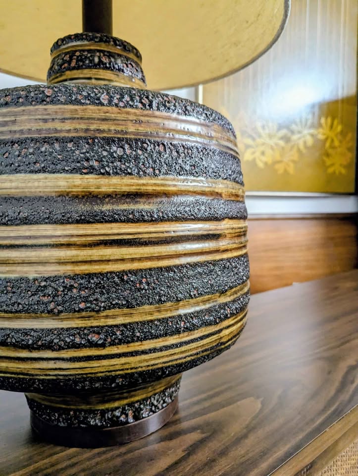 Excellent mid century modern pottery lamp with original shade. Come see it at our shop in South Tacoma!