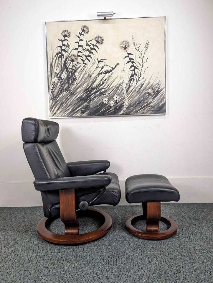 Ekornes Stressless Black Leather Lounge Chair Recliner & Ottoman