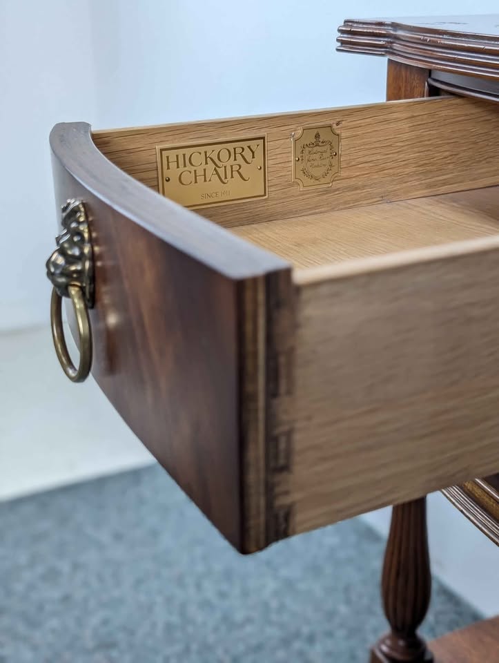 Little antique mahogany table, features cool lions head drawer pulls from the Historical James River Plantations Collections by Hickory Chair. Made in πΊπΈ USA!