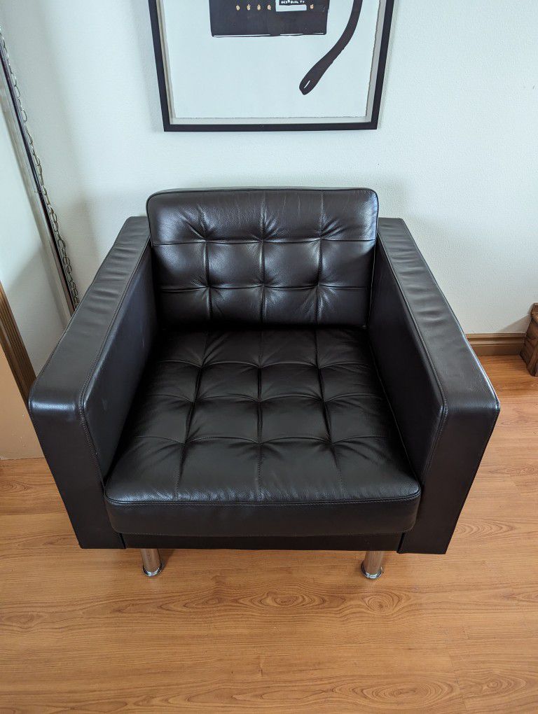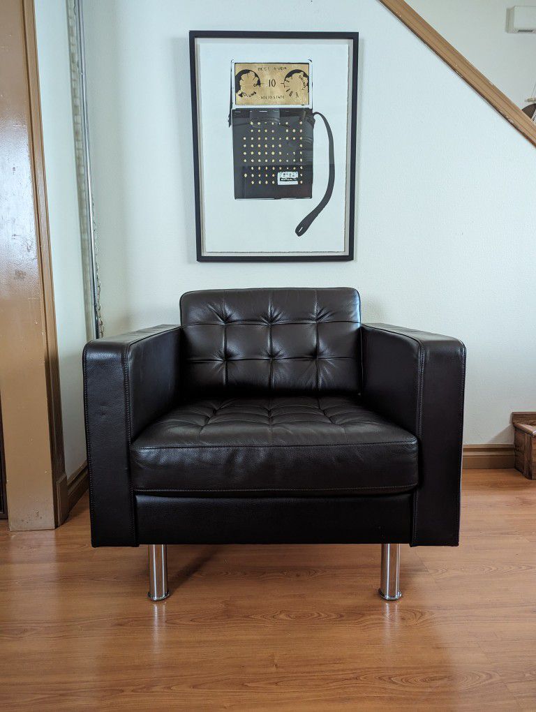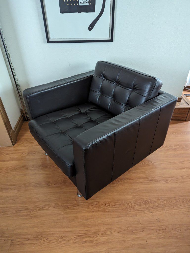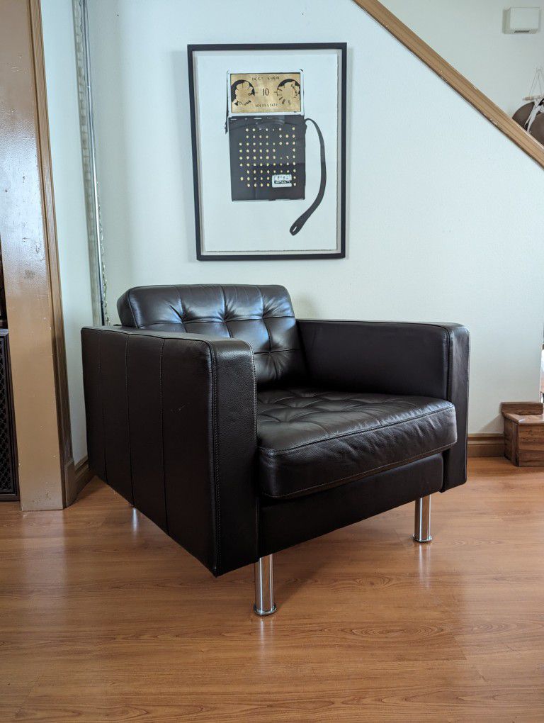 Plush lounge chair from the Landskrona collection by Ikea. Features super soft top grain leather over a solid wood frame on chrome legs. Comfortable, solid & structurally sound. Delivery available.