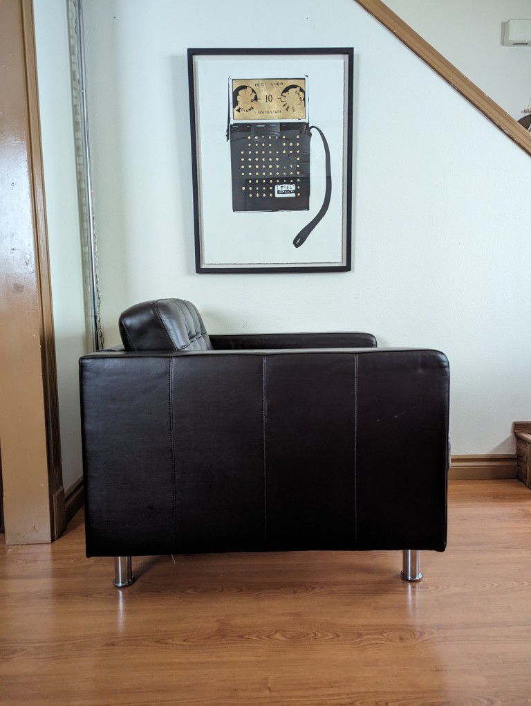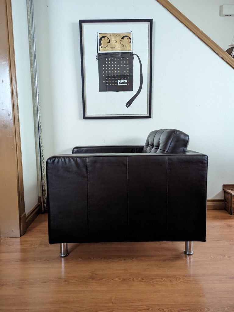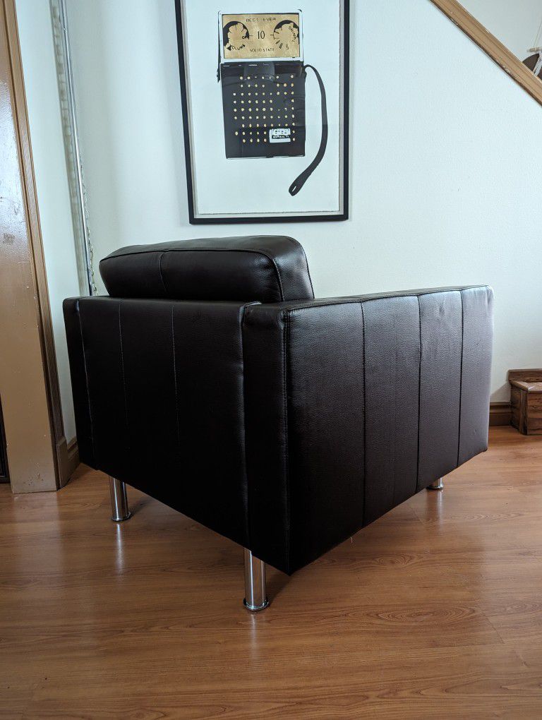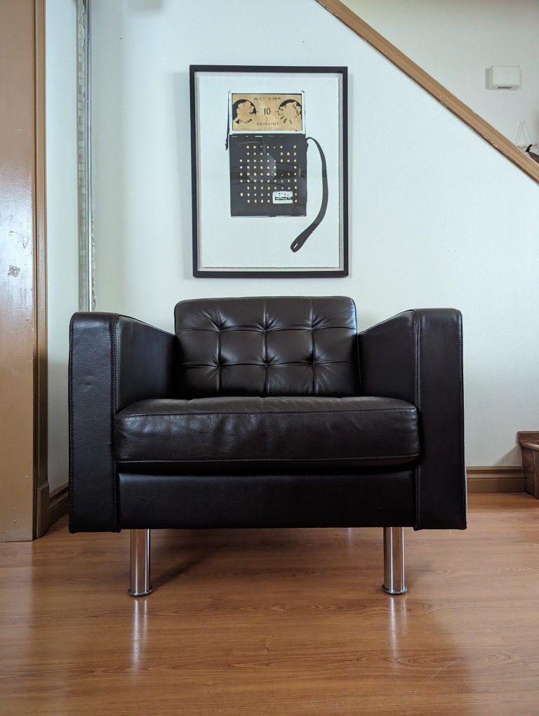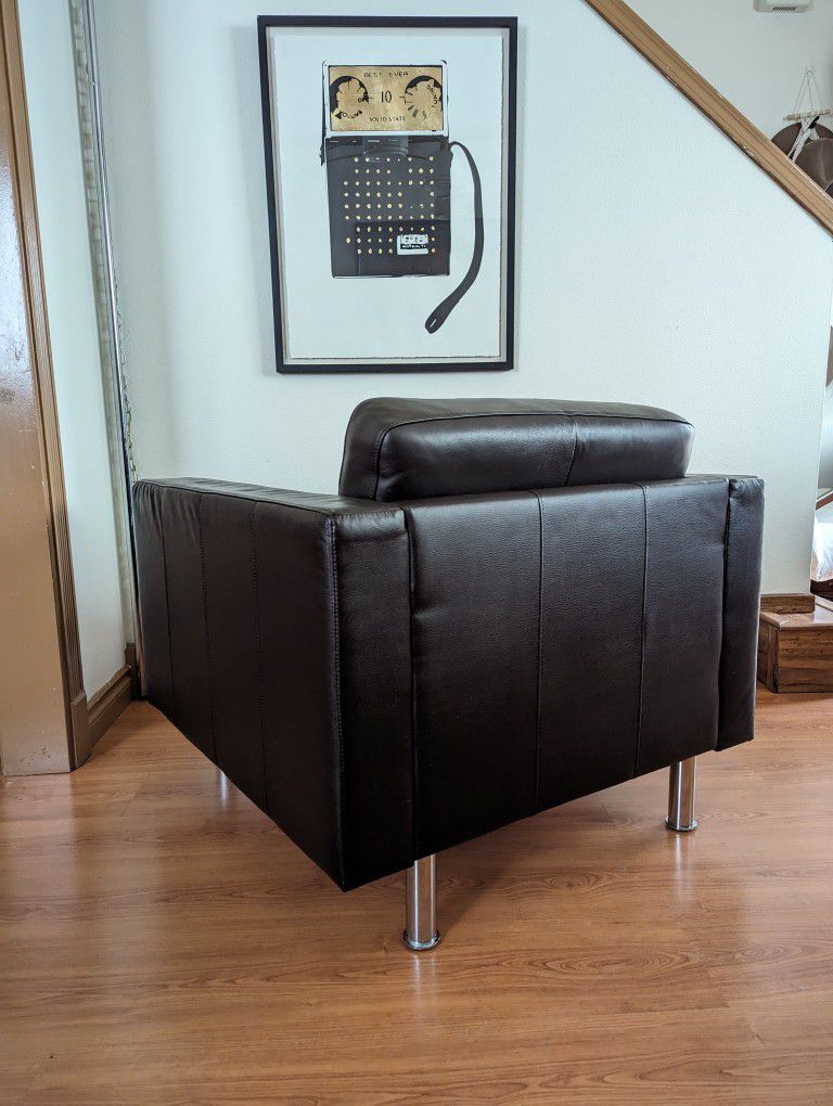Plush lounge chair from the Landskrona collection by Ikea. Features super soft top grain leather over a solid wood frame on chrome legs. Comfortable, solid & structurally sound. Delivery available.