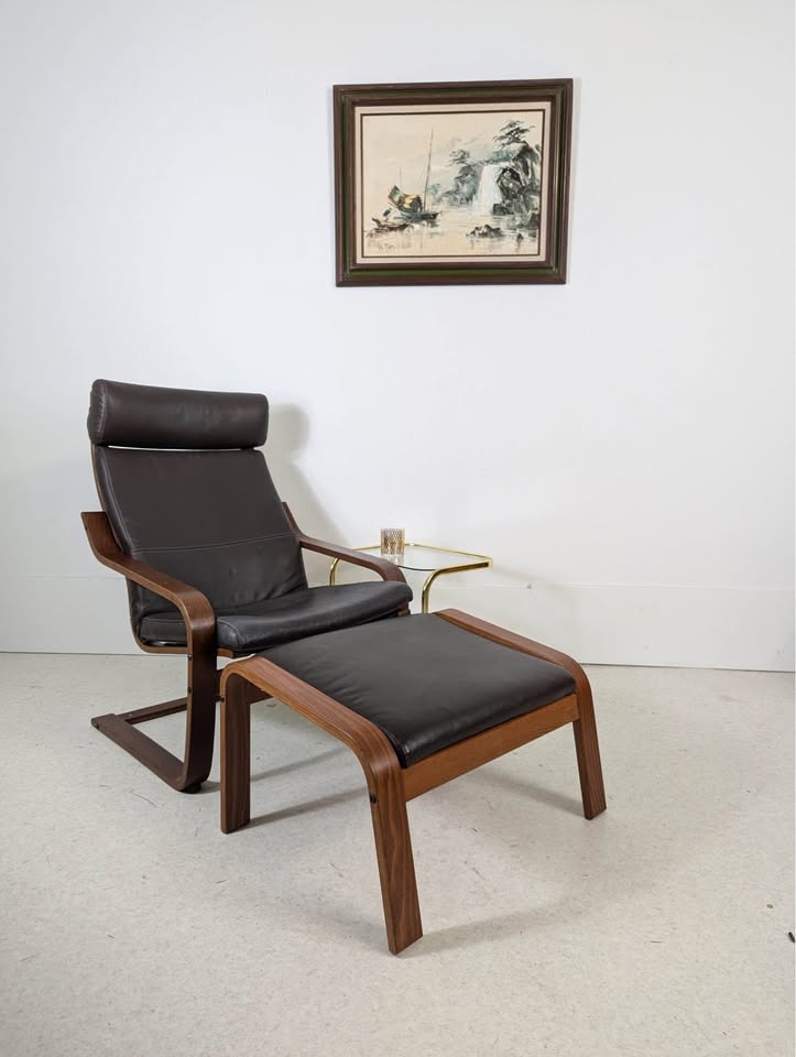 IKEA Poang Brown Leather & Teak Framed Lounge Chair & Ottoman
