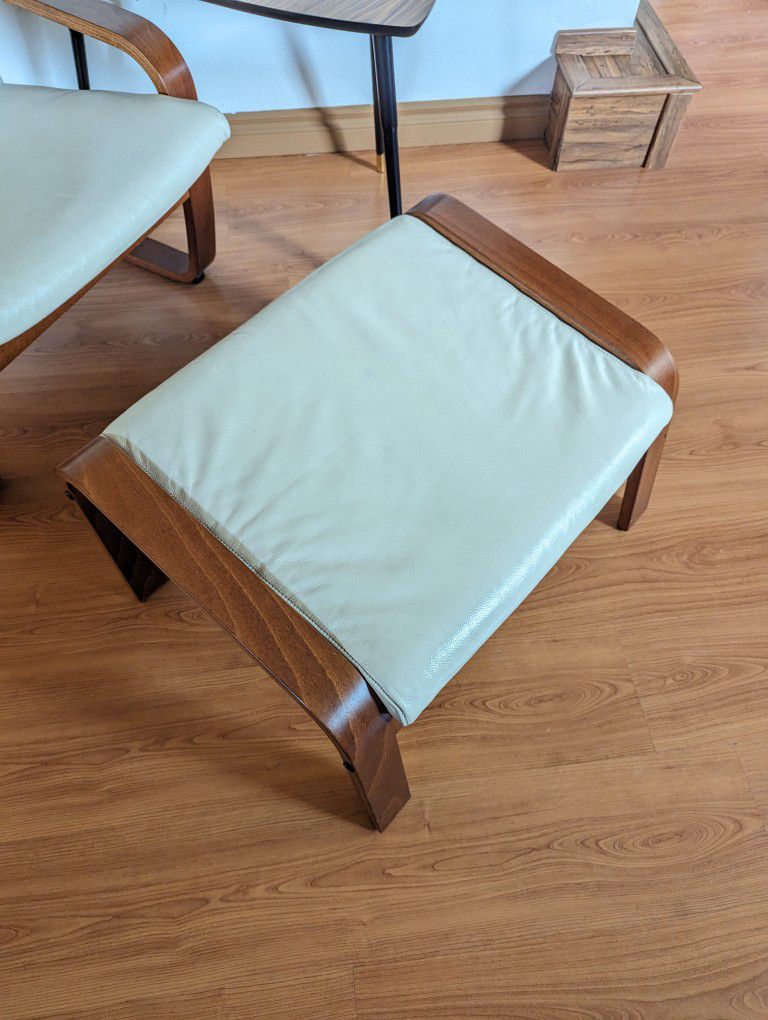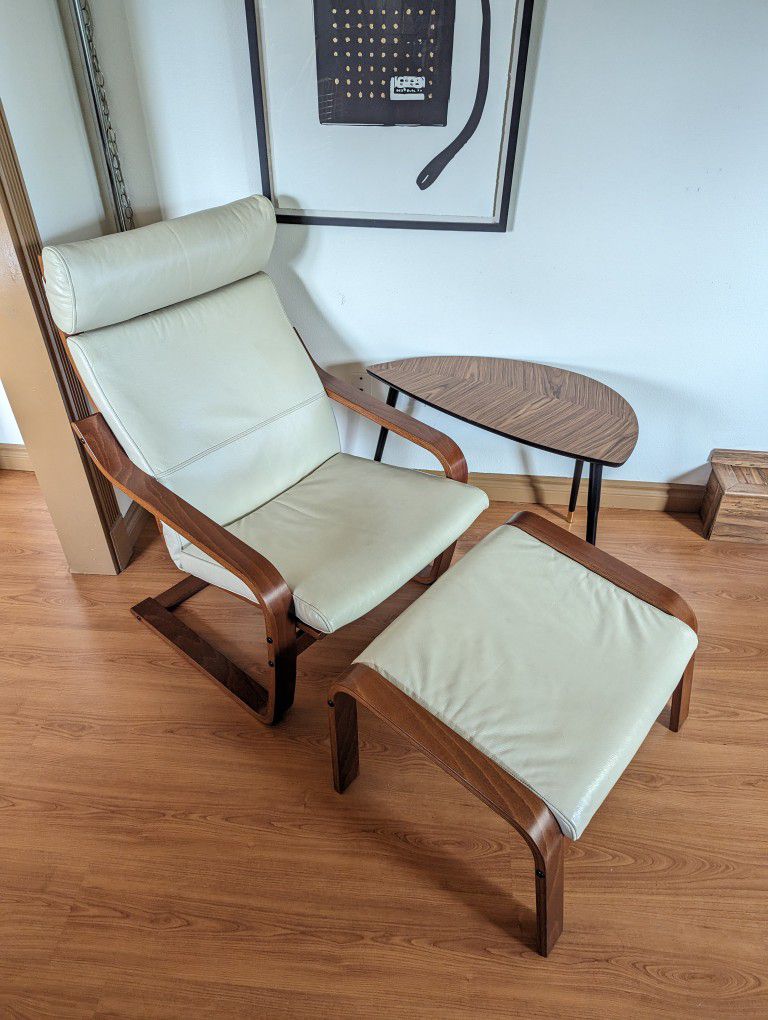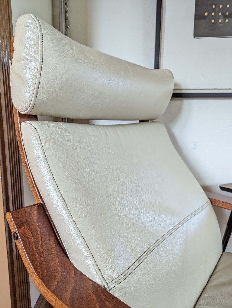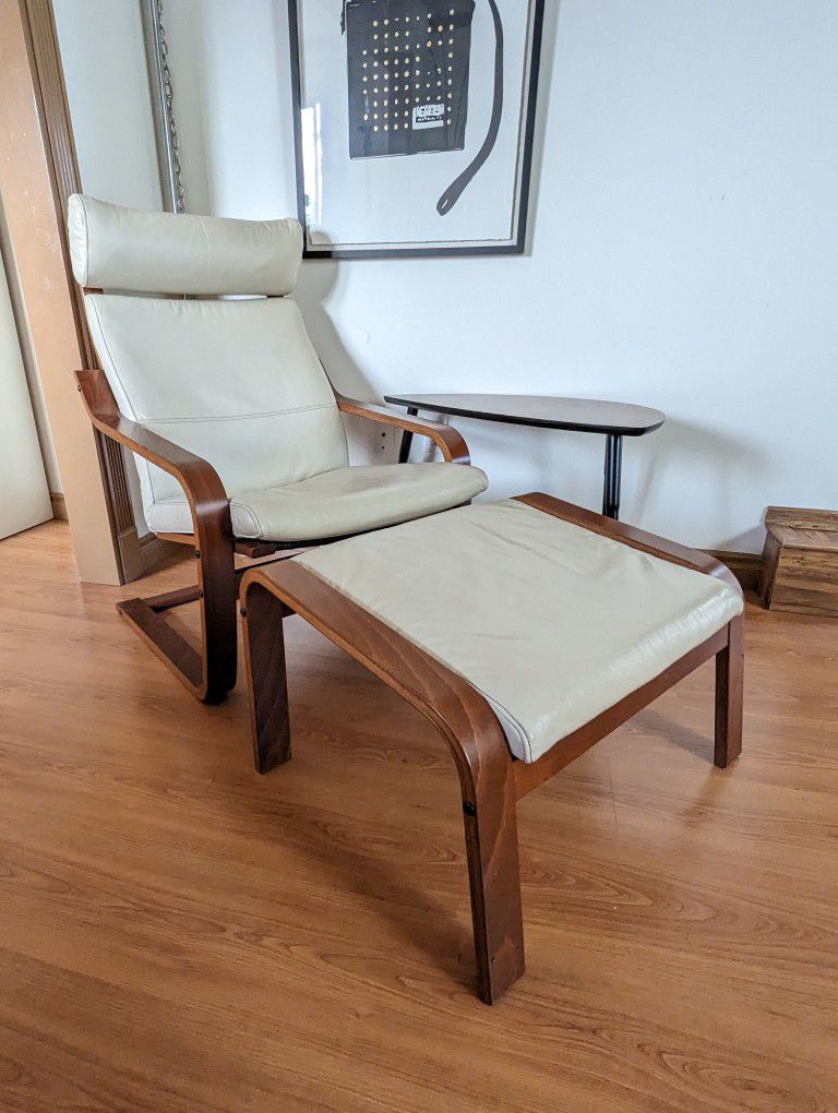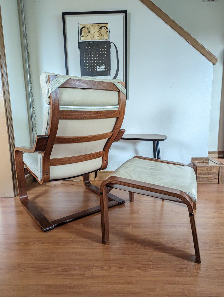 IKEA Poang Teak & Ivory Leather Lounge Chair & Ottoman