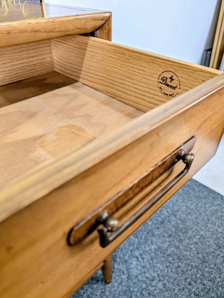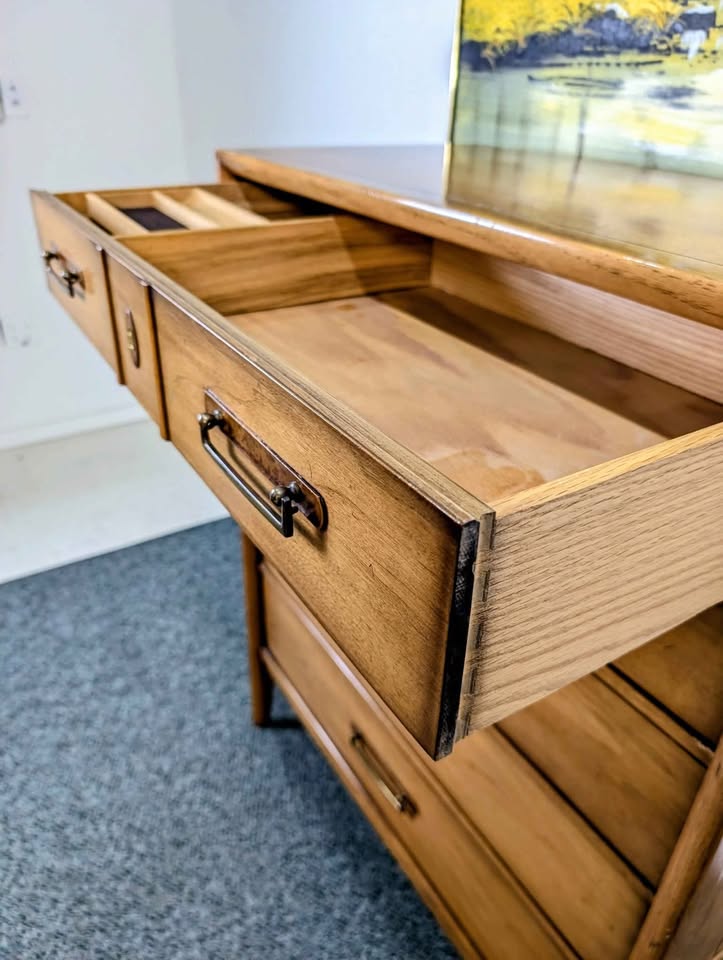 Beautiful mid century modern Meridian Collection Highboy by Drexel. Features walnut construction with 5 smooth gliding, dovetailed drawers and a sliding valet tray in top drawer. Other pieces also available in this collection, sold separately. Circa 1960's. Made in 🇺🇸 USA!Â