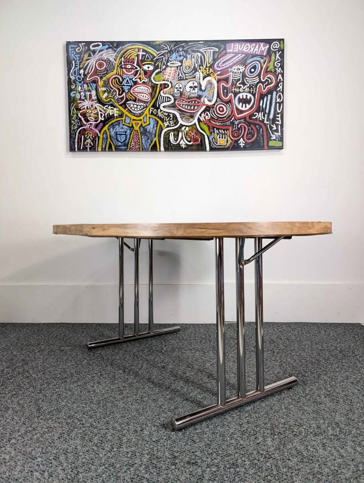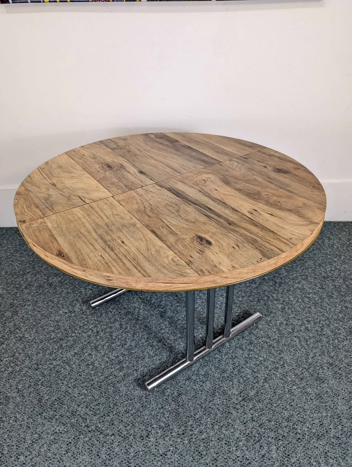 Ultra cool mid century atomic modern dining set with a round to oval expanding dining table that seats 4 or 6 people with the extension leaf. Made in 🇺🇸 USA! Additional photos available upon request. Free delivery within a 5 mile radius. Â