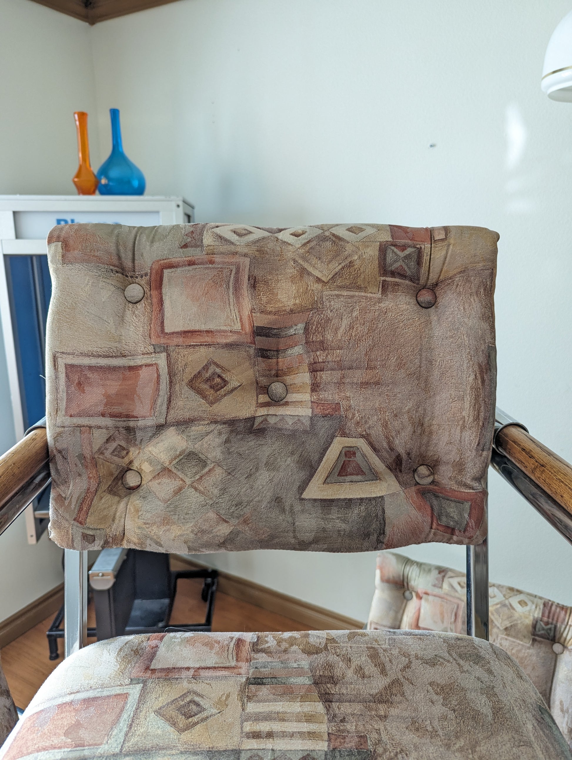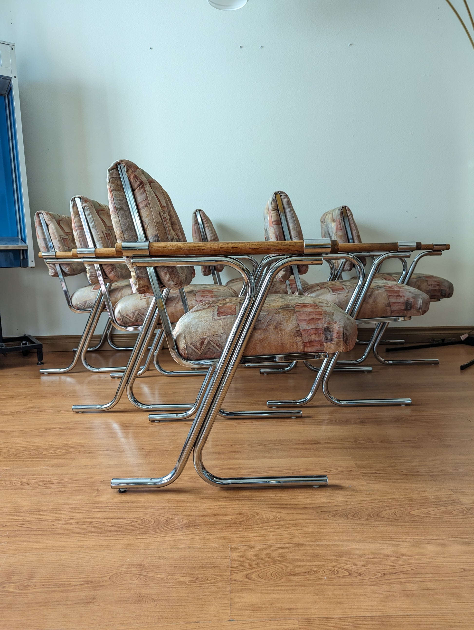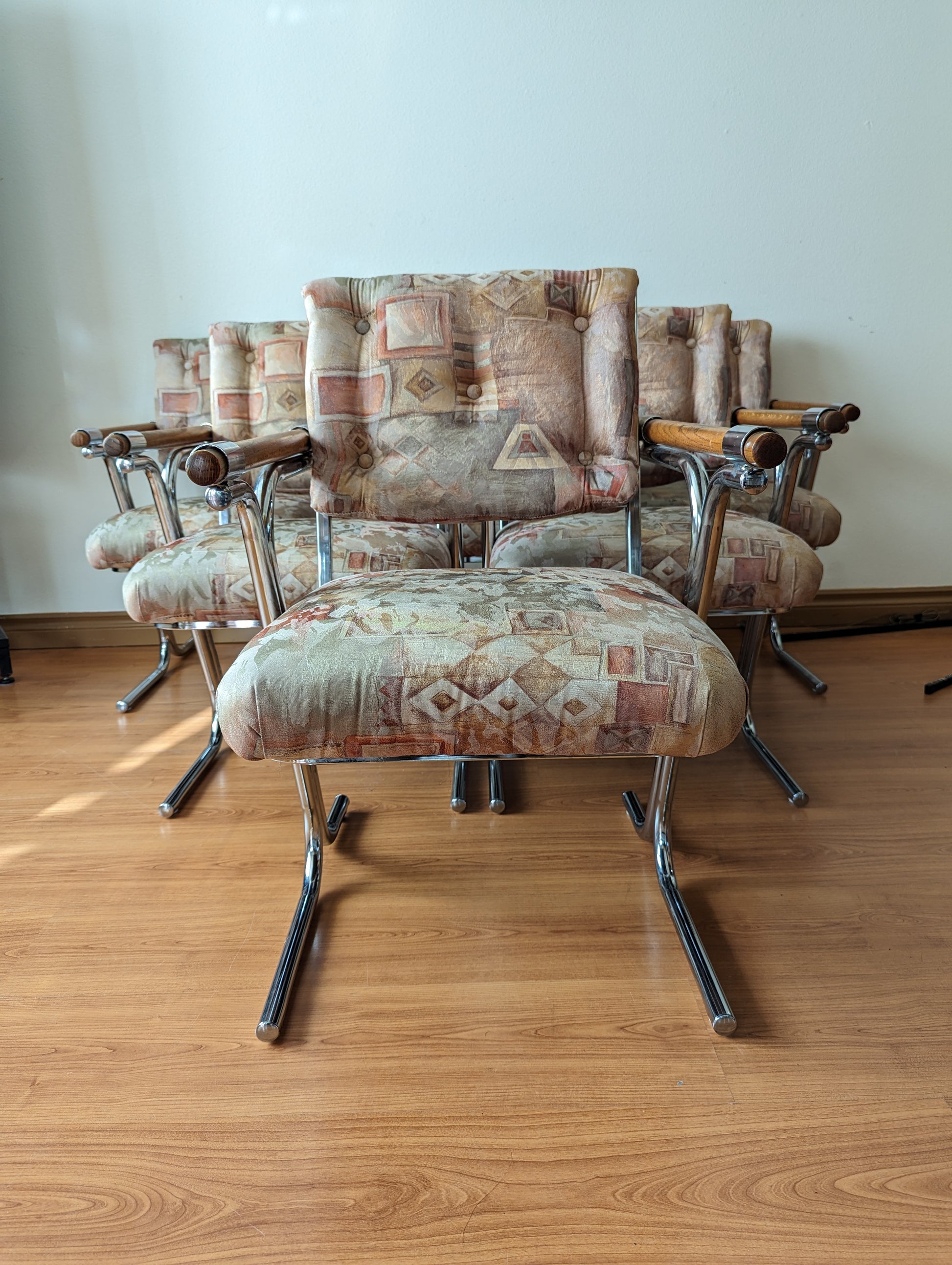 Amazing set of 6 arm chairs by Douglas of California. The wood arm rests nestle inside the chrome frame, very similar to Cleo Baldon, but the base is very similar to Jerry Johnson. Chairs were reupholstered by the previous owner, and could mesh well with a postmodern to mcm style home.