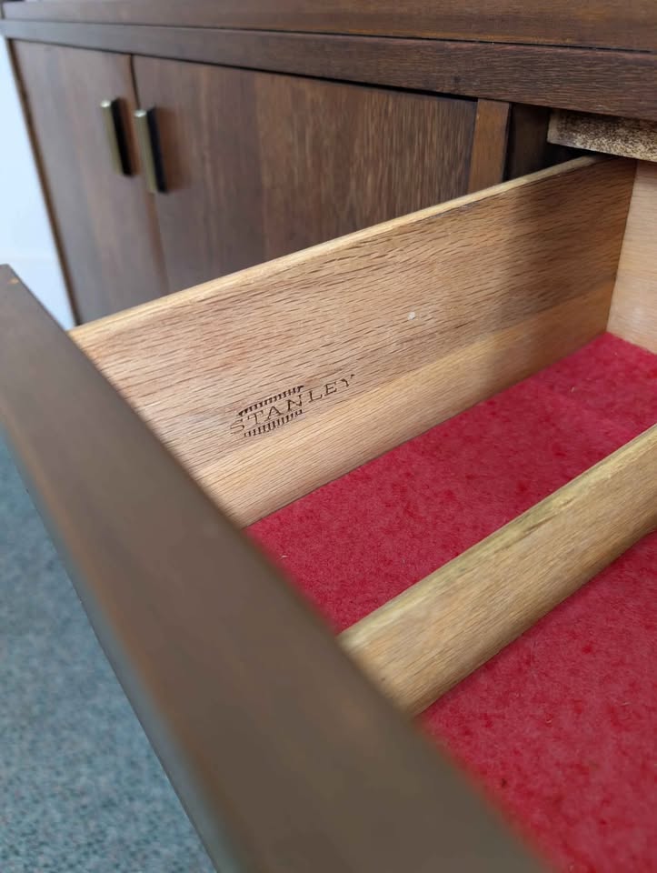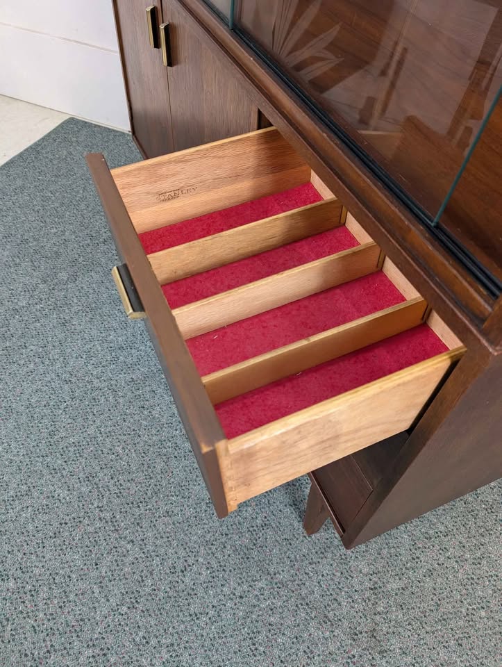 Nice & large mid century modern walnut China cabinet with tons of storage and 3 smooth gliding, dovetailed drawers by Stanley. Made in 🇺🇸 USA!