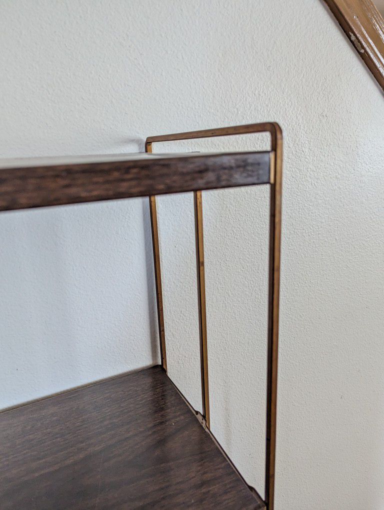 Cool McCobb style mid century bookshelf with metal frame, faux wood shelves and gold accents. Two available, 1 tall & 1 small, individually priced below.
