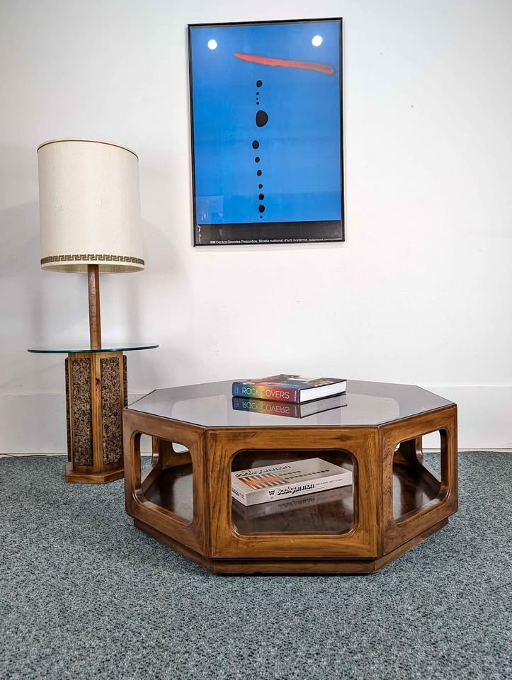 MCM lamp table features walnut framing with cork accents and 3-way lighting. 3 way bulb included.