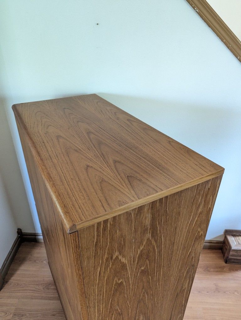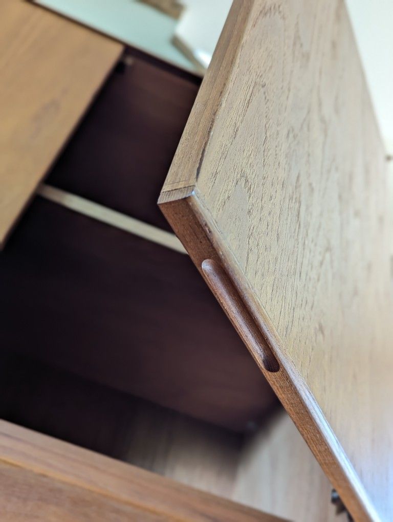 MCM Scandinavian designed chest of drawers by Nordic Furniture. Features beautiful teak veneers with shaped handles on both doors & drawers. Original vintage condition with minimal wear. Made in šØš¦ Canada! Delivery available.