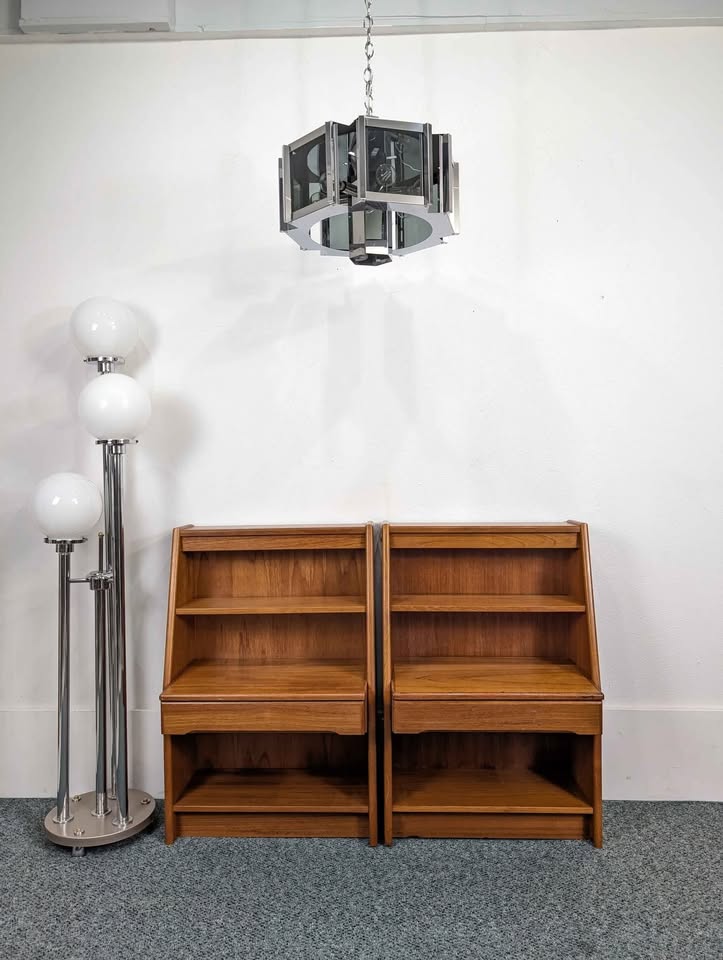 Vintage Scandinavian set of teak nightstands. They each feature a smooth gliding drawer with a display shelf above and storage below.