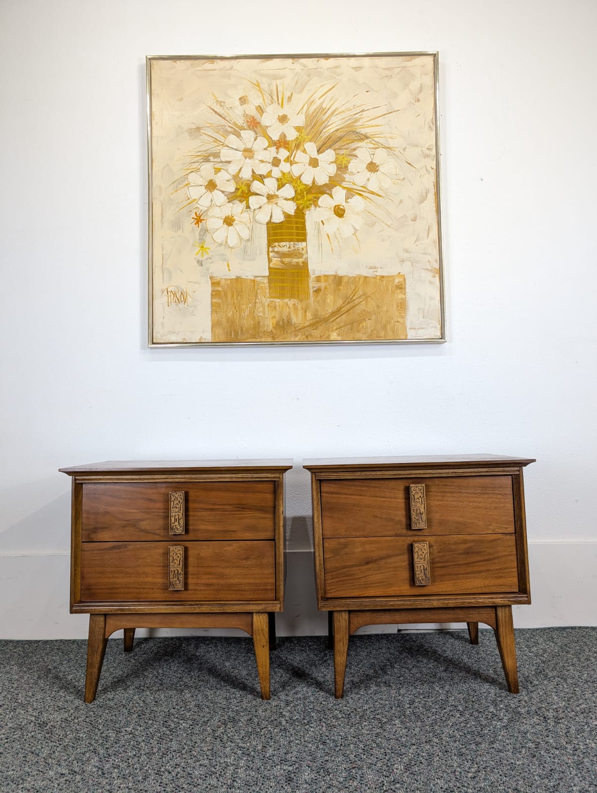 Stunning rare set of mid century modern nightstands by designer Leo Jiranek for Bassett. They feature 2 smooth gliding dovetailed drawers on wooden tracks with Mayan style motifs. Highboy & lowboy are available and sold separately.