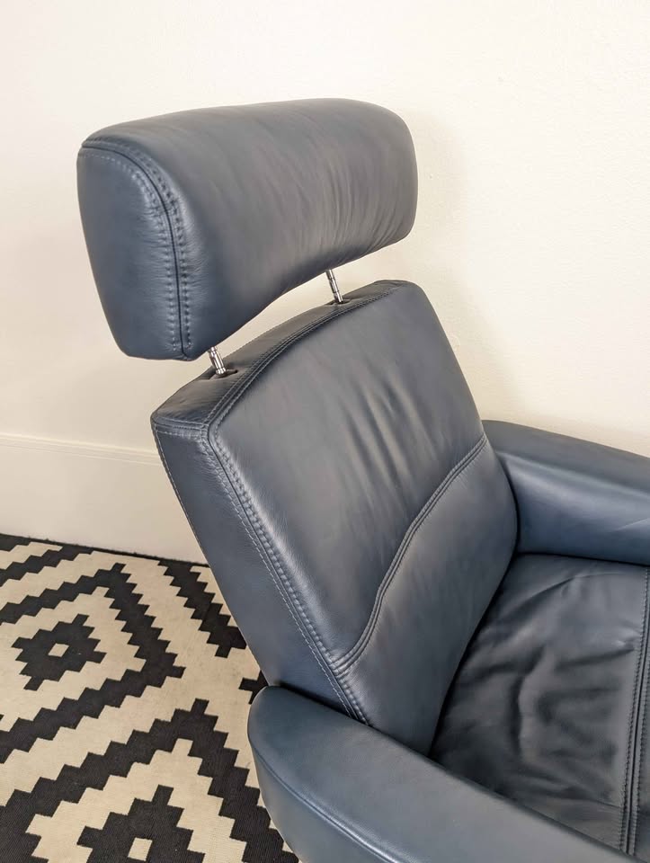 Beautiful Ekornes Stressless style top grain leather recliner by Nordic Home. Features buttery soft blue leather on a solid wood swiveling base & matching ottoman. Come see it at our shop in South Tacoma!
