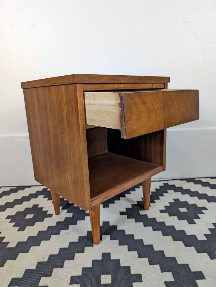 Great little vintage nightstand by Ward. Features walnut veneered construction with a faux wood laminate top & a single, smooth gliding dovetailed drawer. Made in 🇺🇸 USA!