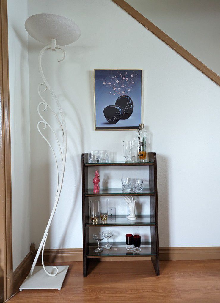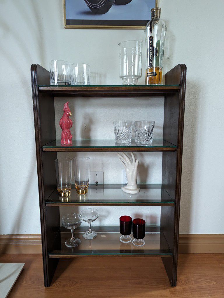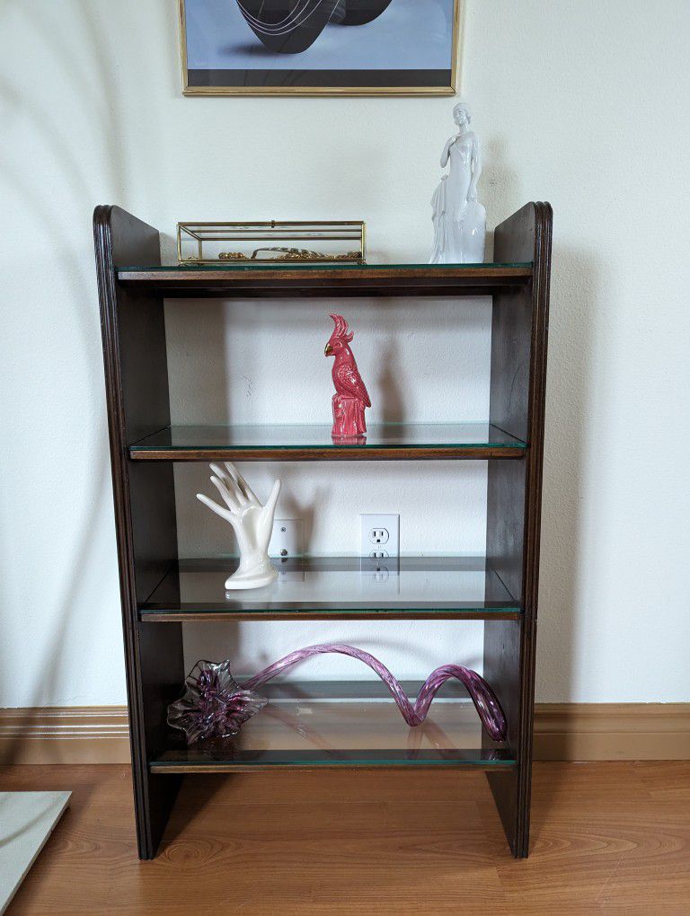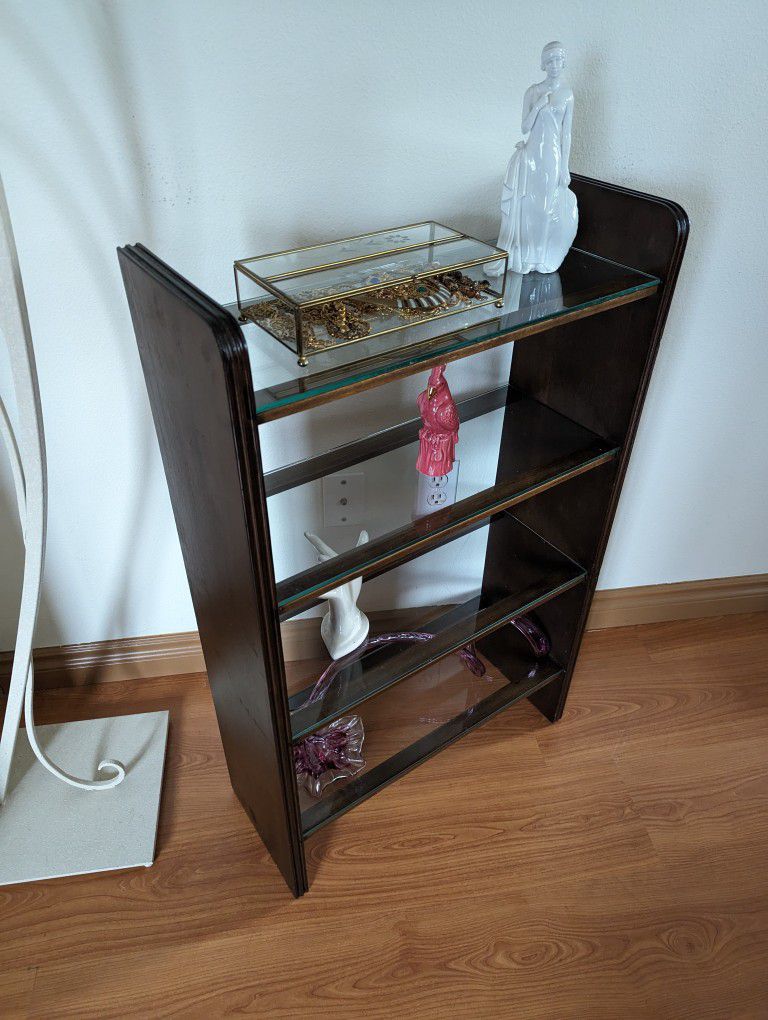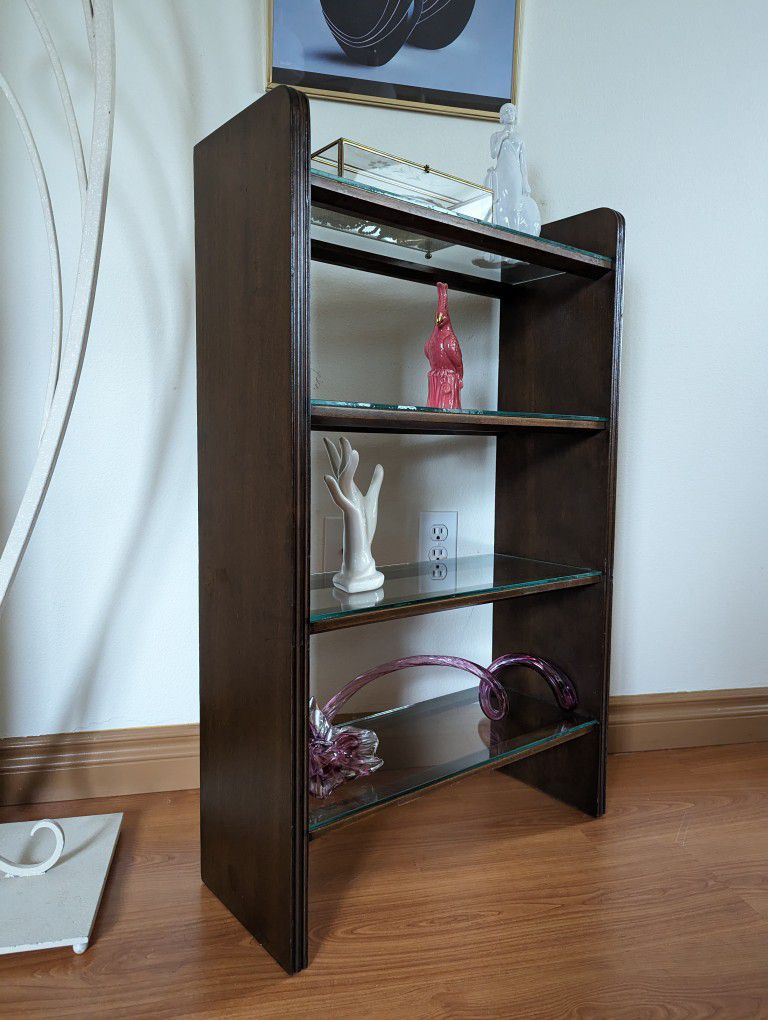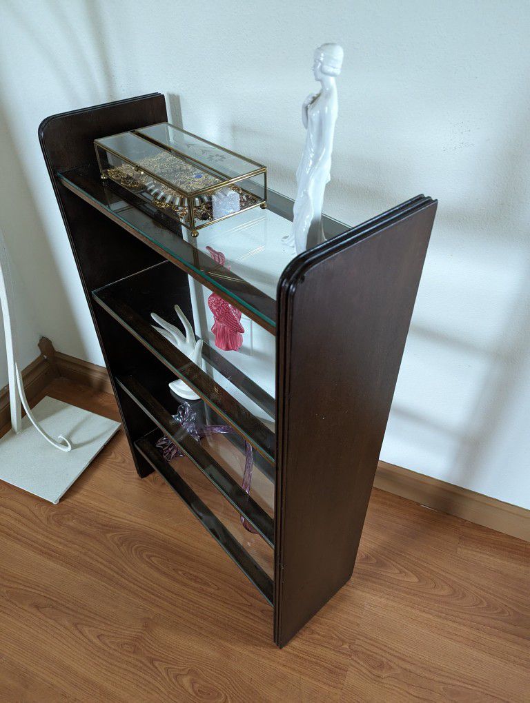 Great little 4 tiered antique shelf. Features solid wood construction with glass shelves and a beautiful art deco waterfall design. Made in USA! Delivery available.