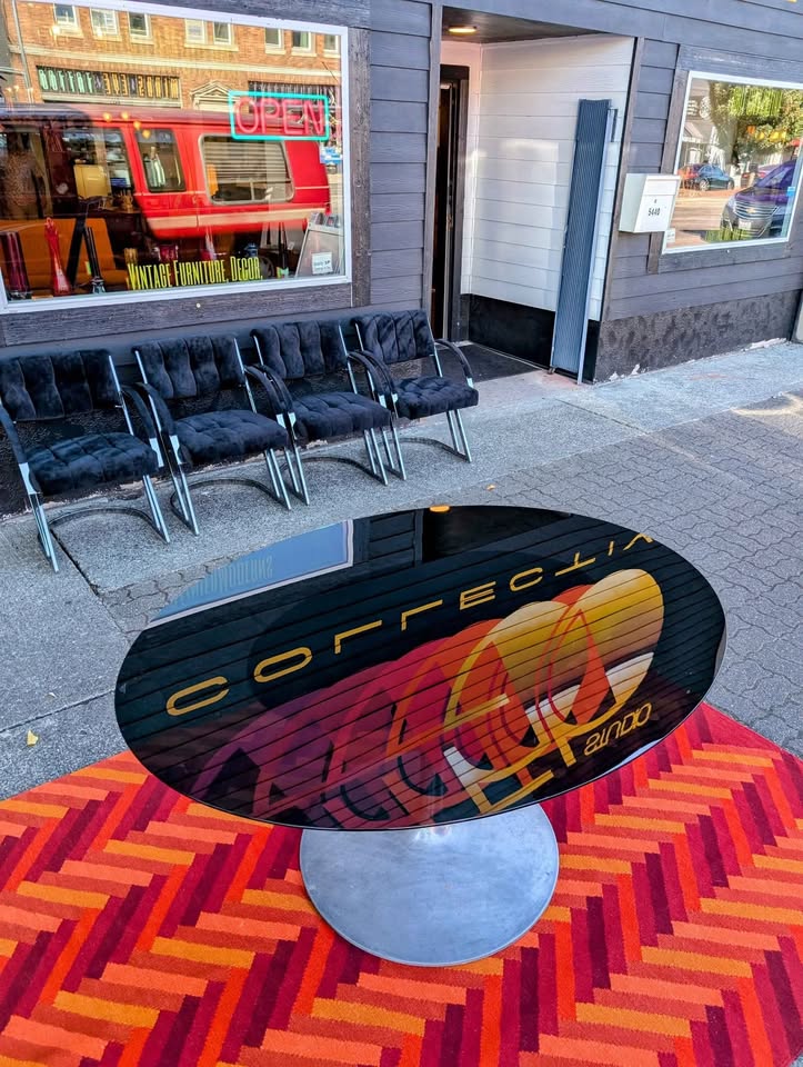 Stunning mid century modern dining table & 4 chair set by Cal Style! Features high polished chrome cantilevered Z chairs with black velvet upholstery & a tulip pedestal table base with an oval shaped smoked glass top. Made in 🇺🇸 USA!