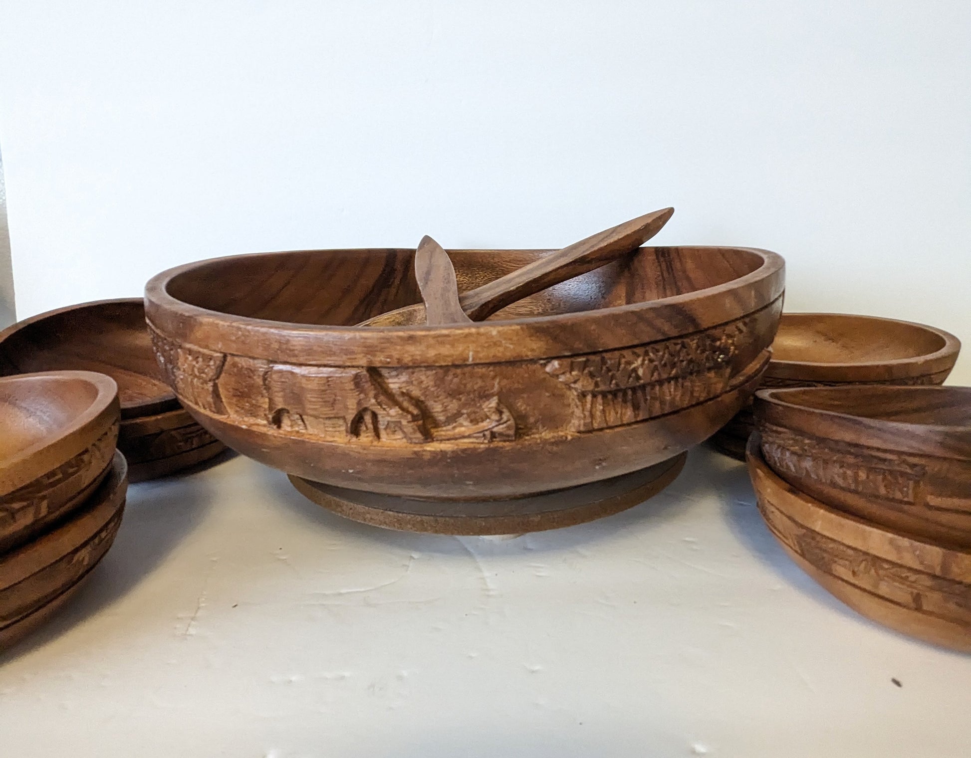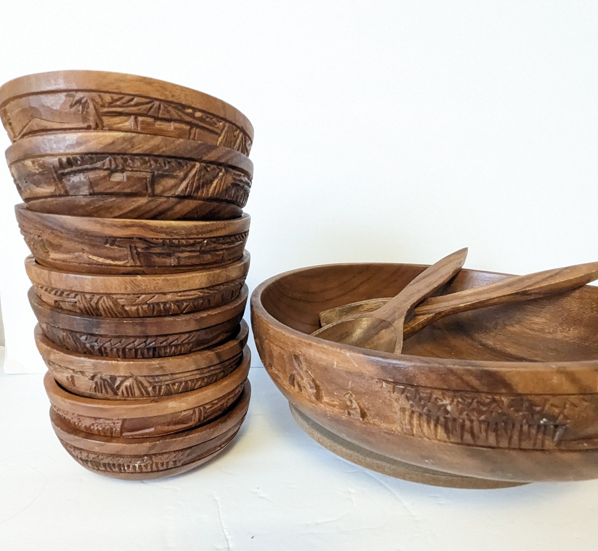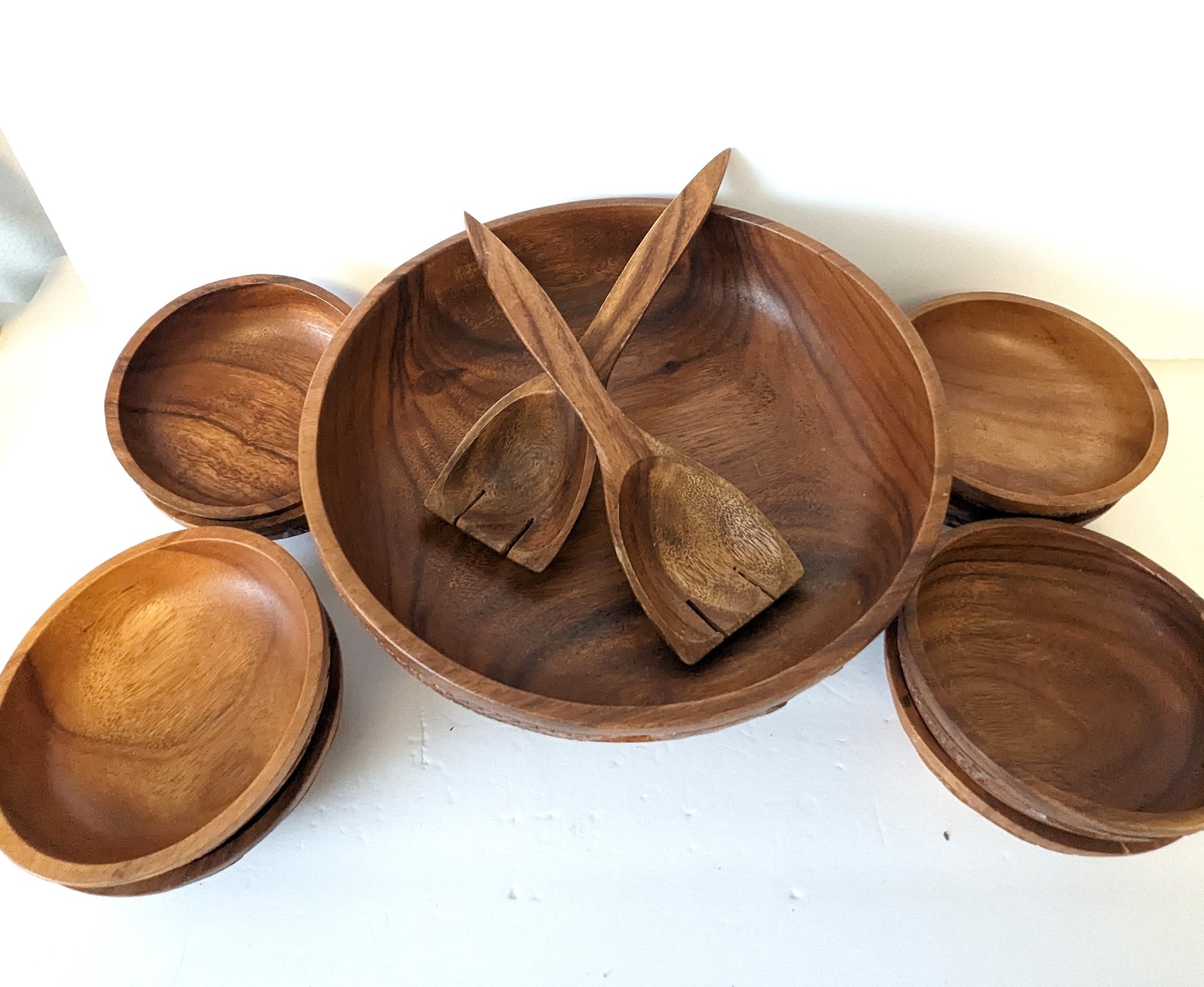 Vintage Monkey Pod Salad Bowl Serving Set w Serving Spoons & 8 Bowls Carved.