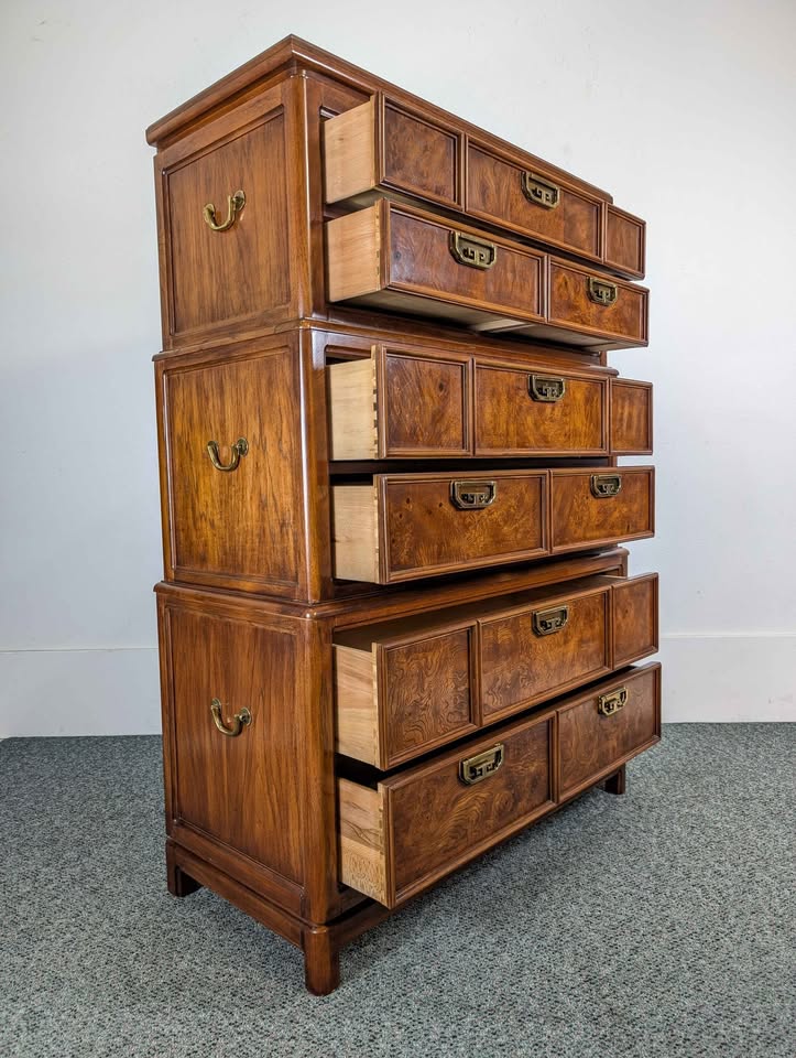 Handsome chest of stacked drawers from the Mystique Collection by Thomasville. Features solid wood construction with 6 beautifully dovetailed drawers, burled wood accents & high polished brass hardware. Made in 🇺🇸 USA!