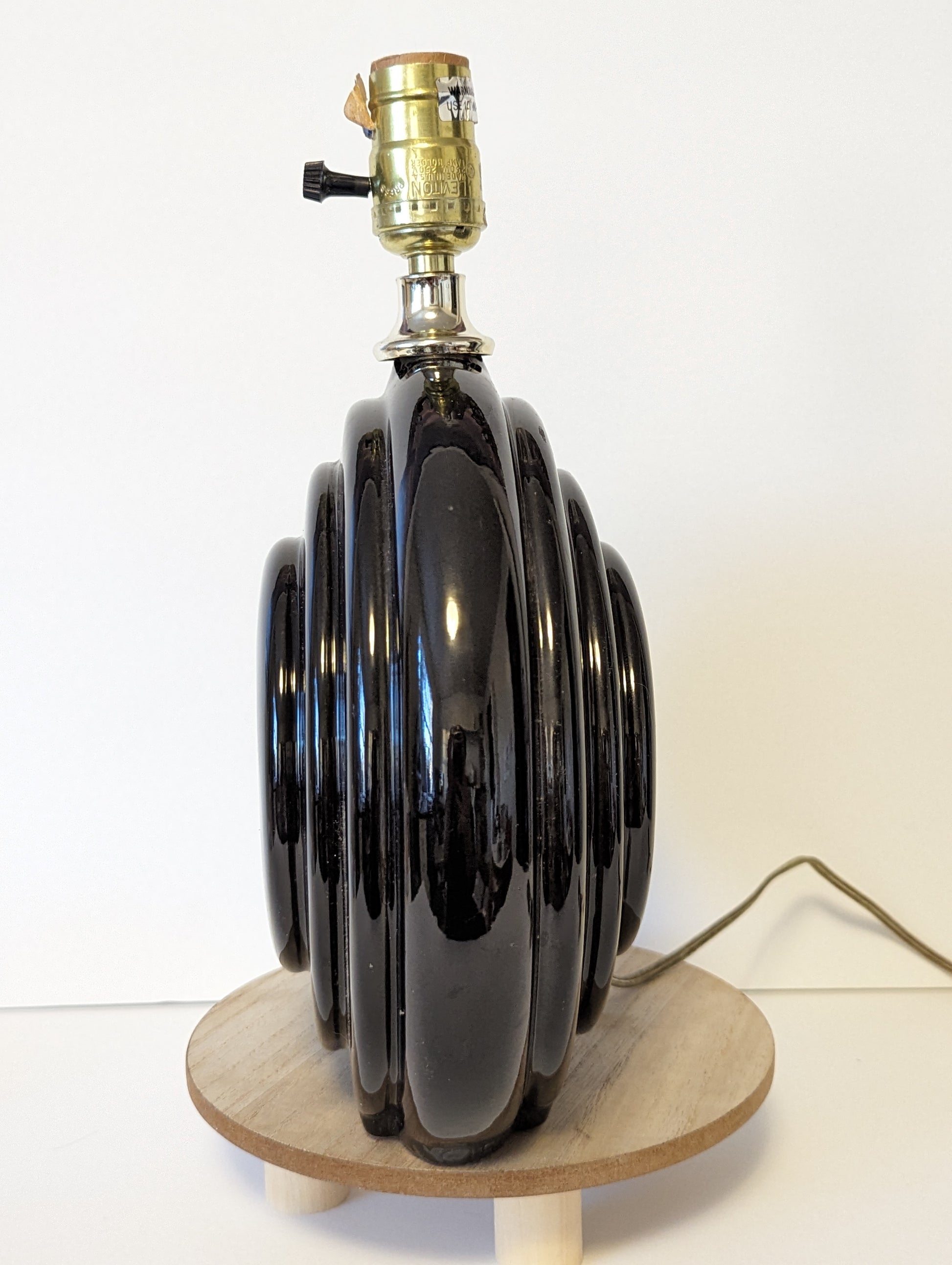 Awesome postmodern 80s - 90s ceramic black table lamp. No harp or shade, but overall in good working condition. Small scuff/ imperfection on the front.